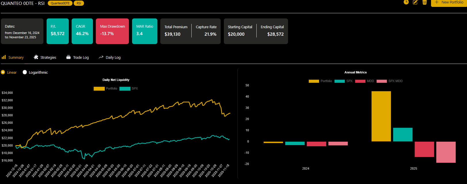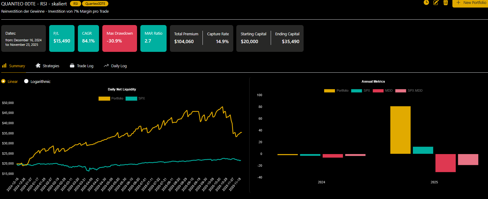 Folgende Screenshots zeigen das Backtestergebnis des QUANTEO XDTE Handelssystems "QUANTEO 0DTE - RSI" über einen Zeitraum von knapp einem Jahr (16.12.2024 - 23.11.2025):