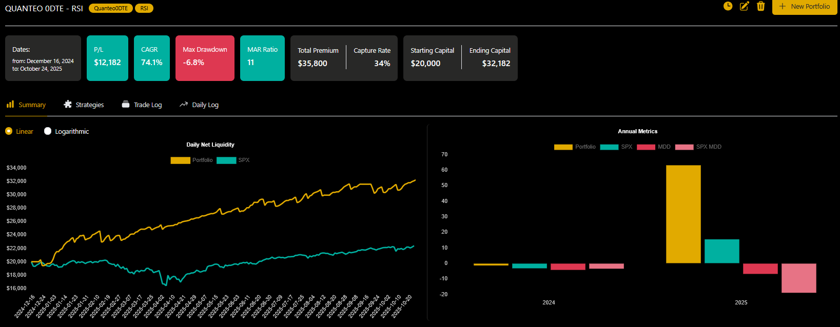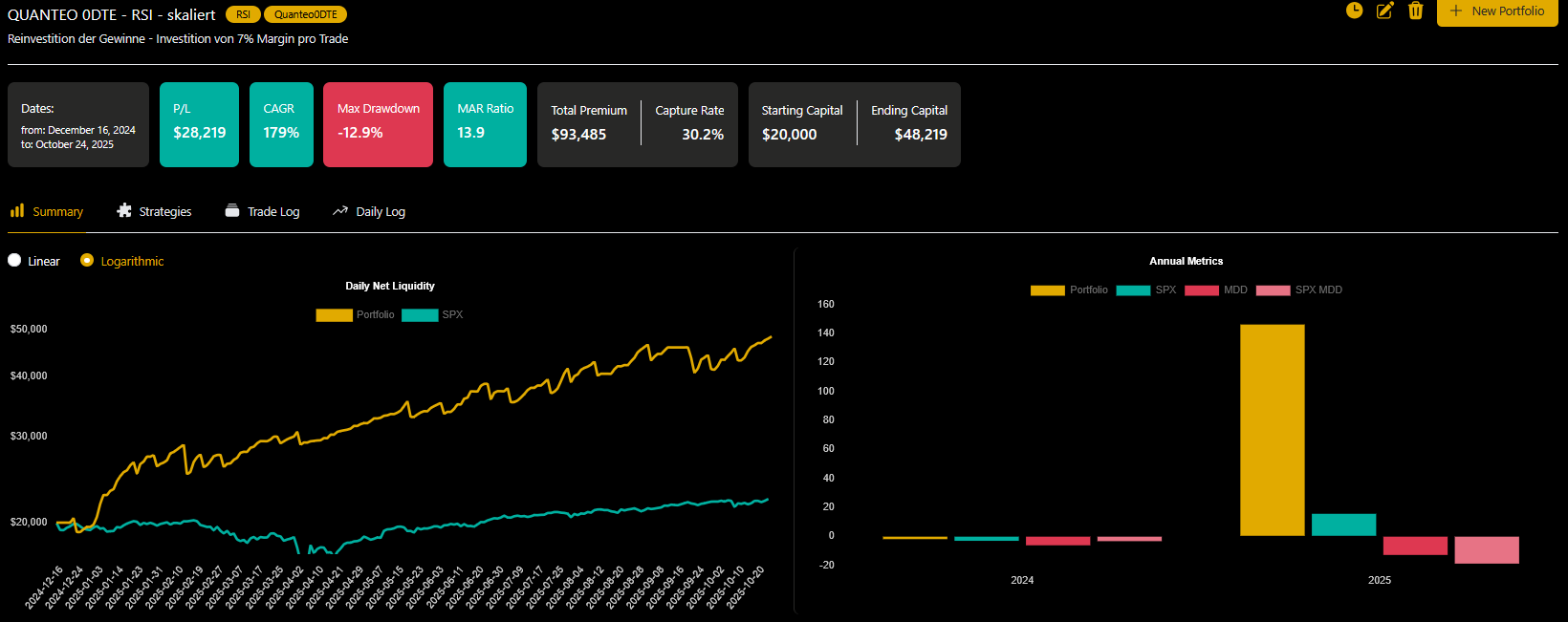 Folgende Screenshots zeigen das Backtestergebnis des QUANTEO XDTE Handelssystems "QUANTEO 0DTE - RSI" über einen Zeitraum von knapp einem Jahr (16.12.2024 - 24.10.2025):
