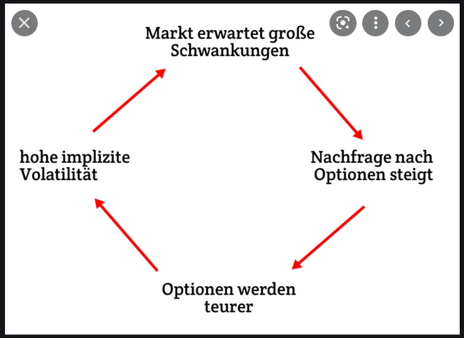 Grundsätzlich drückt ein hoher Wert der impliziten Volatilität eine höhere erwartete Schwankungsbreite aus als ein niedriger Wert. Die implizite Volatilität nimmt zu, wenn auch die Schwankungsbreite des jeweiligen Marktes zunimmt. Folgende Grafik verdeutlicht den Kreislauf: