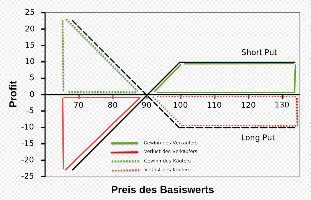 Der Käufer der Option kauft diese zu einem Kurs von 10 USD und erwirbt dafür das Recht, die Aktie zu einem Kurs von 90 USD zu verkaufen, unabhängig davon, wo der Kurs der Aktie steht.