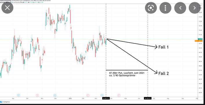 Beim vertikalen Rollen, wird ein Strike ausgewählt, der unterhalb des Strikes der zu schließenden Option liegt. Optimalerweise auch noch unterhalb des aktuellen Kurses des Underlyings. Aber das hängt vom Verlauf des Underlyings ab. Bei einem stärkeren Abverkauf wird es nicht oder nur schwer möglich sein, in einen Strike unterhalb des Preises des Underlyings zu wechseln.