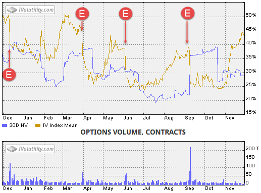 Grafisch sieht der Verlauf der impliziten Volatilität nun wiefolgt aus. Die Termine an denen Unternehmenszahlen veröffentlicht wurden, sind mit einem E gekennzeichnet. Das Abfallen des IV Index ist am Tage der Earnings deutlich sichtbar.