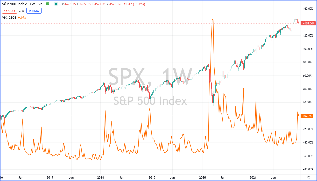 Es ist allerdings auch möglich, den Verlauf des VIX nicht alleine für sich genommen zu betrachten, sondern mit dem Verlauf des S&P 500 in Kombination zu bringen. So wie die letzte Grafik im vorhergehenden Abschnitt dies bespielhaft verdeutlicht.