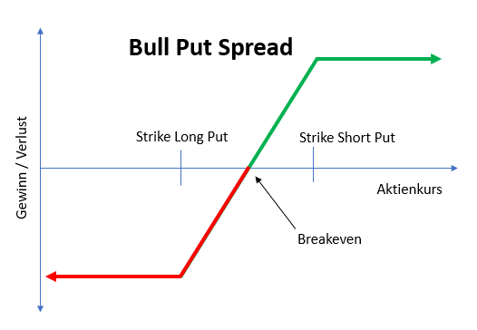 Das Pay-Off dieser Kombination aus Long und Short Put Position, die man übrigens Bull Put Spread nennt, sieht wiefolgt aus: